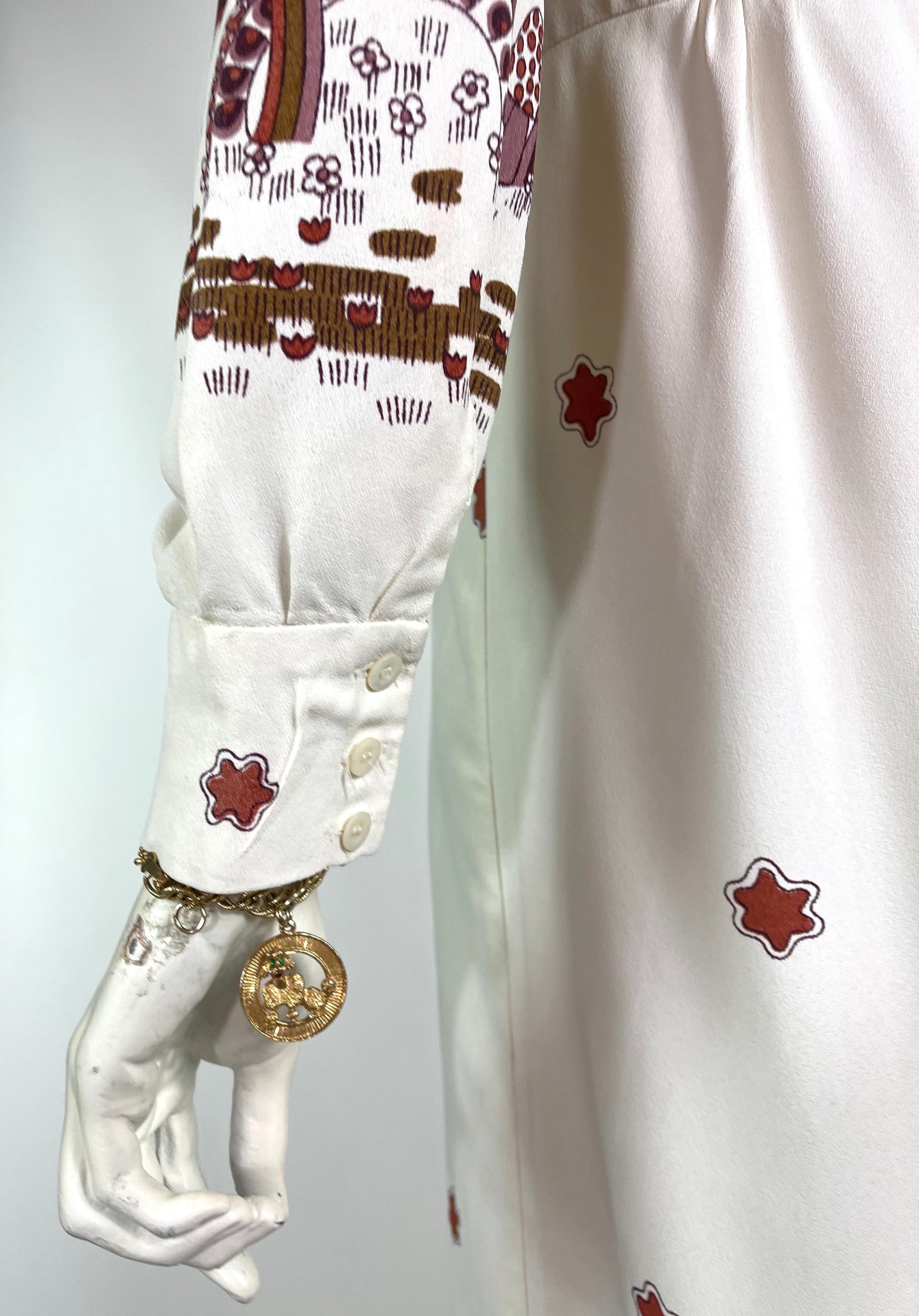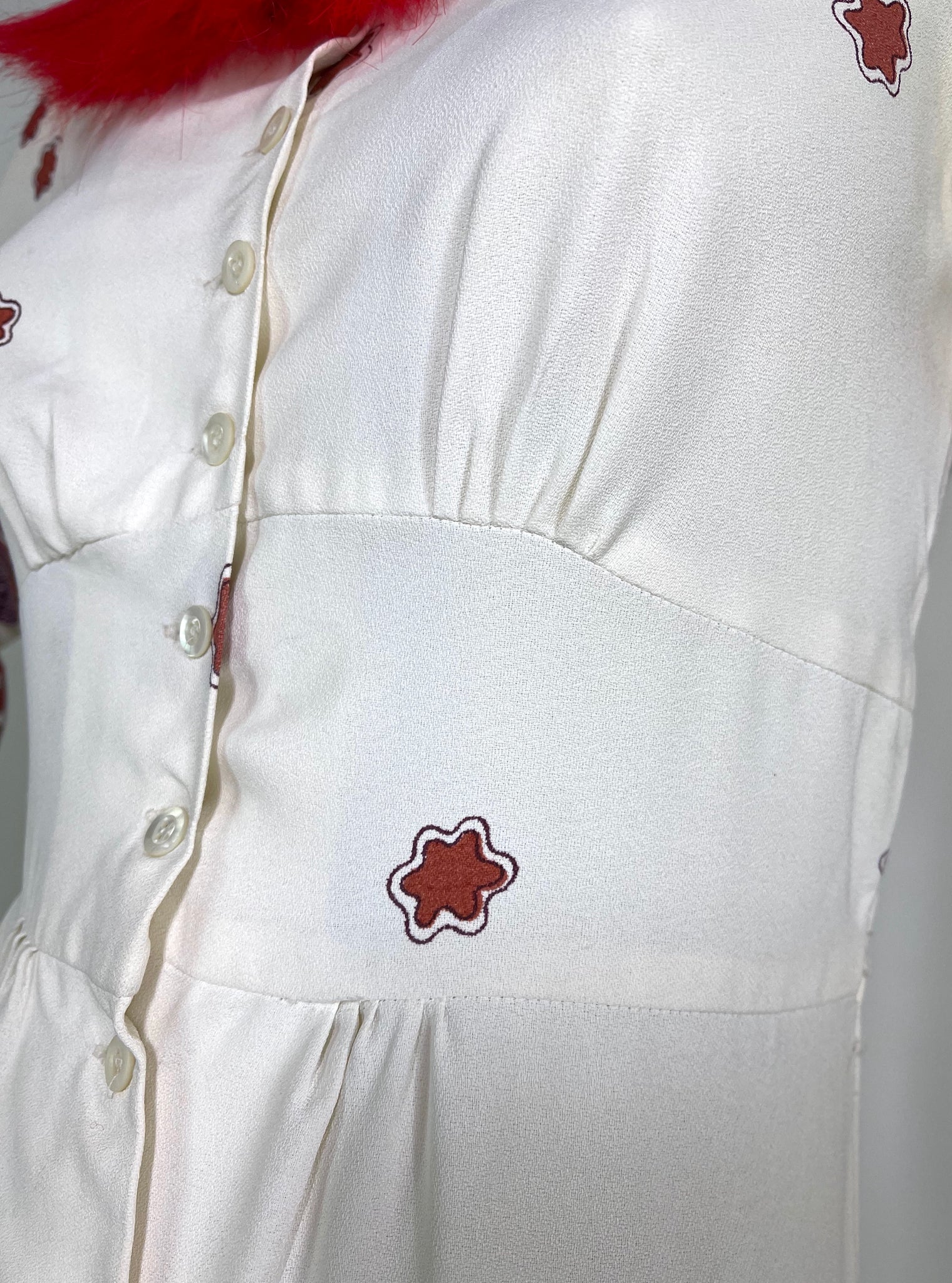 Condition: Good vintage condition. Mild overall wear. A couple of faint marks near neck line, some tiny nicks or pulls nothing to noticeable. Print is vivid and strong. All buttons present. Price does reflect. Sold as vintage.