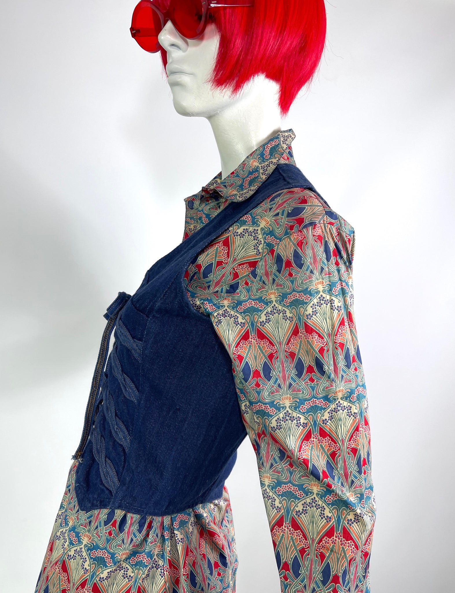 A stunning print on this example with colours including deep blue, cherry red, sand, denim blue and tangerine...one single breast pocket and seven buttons for closure...